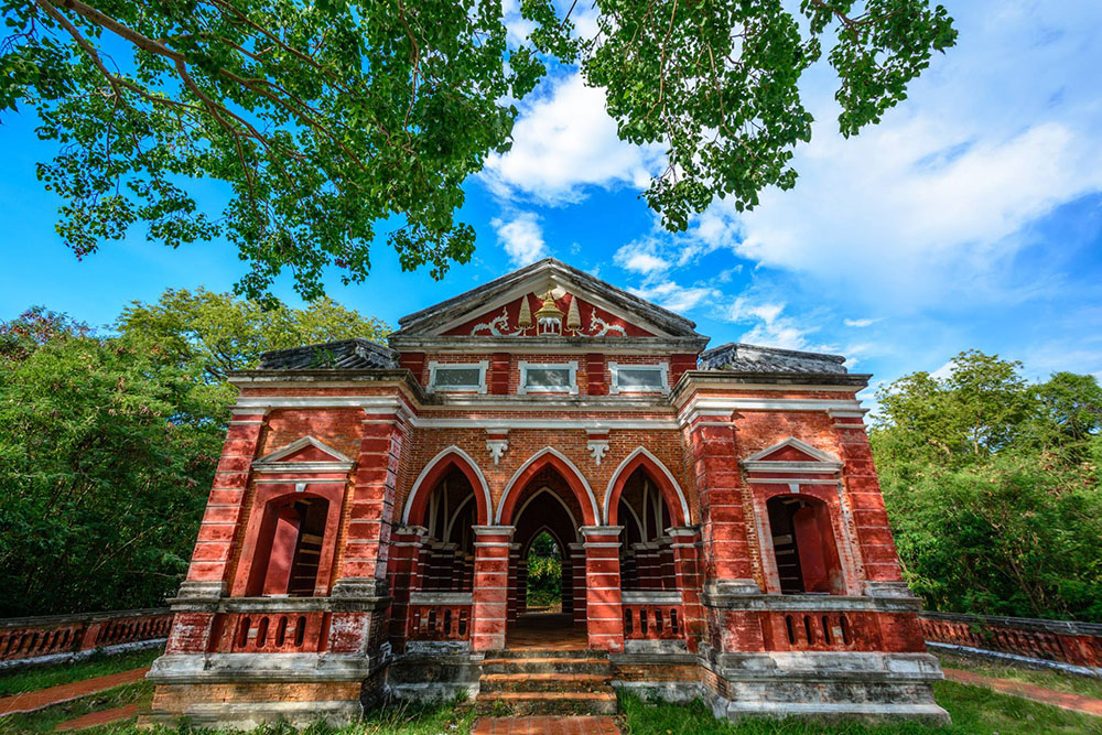ศาลาวิหารแดง หรือพลับพลาที่ประทับของพระบาทสมเด็จพระจอมเกล้าเจ้าอยู่หัว (รัชกาลที่ ๔ ) ตั้งอยู่บนยอดเขาชั้นที่ ๒ ประวัติการก่อสร้างศาลาพระวิหารแดง ซึ่งพระบาทสมเด็จพระจอมเกล้าเจ้าอยู่หัว (รัชกาลที่ ๔) มีพระราชดำริให้สร้างพลับพลาเป็นที่ประทับแต่การก่อสร้างยังไม่แล้วเสร็จก็สิ้นรัชกาลของพระองค์คงสร้างค้างคาอยู่ ต่อมาเมื่อปี พ.ศ. ๒๔๓๒ พระบาทสมเด็จพระจุลจอมเกล้าเจ้าอยู่หัวเสด็จประพาสภาคใต้และแหลมมลายู เมื่อมาถึงเมืองสงขลาได้เสด็จพระราชดำเนินขึ้นไปนมัสการพระเจดีย์หลวงบนยอดเขาตังกวน มีพระราชศรัทธาโปรดเกล้าฯ ให้สร้างศาลาพระวิหารซึ่งพระบาทสมเด็จพระจอมเกล้าเจ้าอยู่หัวทรงพระราชดำริไว้จนสำเร็จ ในเวลาต่อมายังทรงพระราชดำริให้สร้างบันไดนาคขึ้นจากพลับพลาสำเร็จเรียบร้อยในปี พ.ศ. ๒๔๔๐ พลับพลาที่สร้างขึ้นตั้งแต่ในรัชสมัยพระบาทสมเด็จพระจอมเกล้าเจ้าอยู่หัว หันหน้าพลับพลาไปด้านเชิงเขาด้านหนึ่งของเขาตังกวน เป็นบริเวณที่วิวเปิดเห็นทิวทัศน์เมืองสงจลาได้ไกลมีความสวยงามมาก ภายในศาลาพระวิหารแดงมีเสาและช่องทางเดินทะลุถึงกัน แต่ละช่องจะมีขนาดเท่ากันและเป็นแบบเดียวกันทั้งหมด ซึ่งสามารถมองจากด้านหนึ่งก็จะเห็นทะลุไปจนถึงอีกด้านหนึ่ง ด้านหลังของวิหารแดงเป็นบันไดนาคทางขึ้นเขาตังกวน ช่องด้านหน้าเป็นทางเดินลงไปเชิงเขาโดยทางบันได